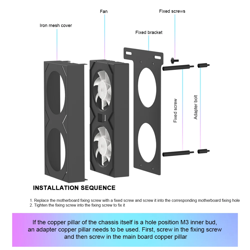 5. Easy Installation and Maintenance: This ram memory cooling fan uses a simple screw installation method with two screws for secure fixing, making maintenance convenient and quick. Users can replace the motherboard fixing screws with the provided fixing bolts, then screw the fixing screws into the bolts. (*If the case’s standoffs are M3 internal threads, use the adapter standoffs to screw in the fixing bolts before screwing into the motherboard standoff holes.)Specification: